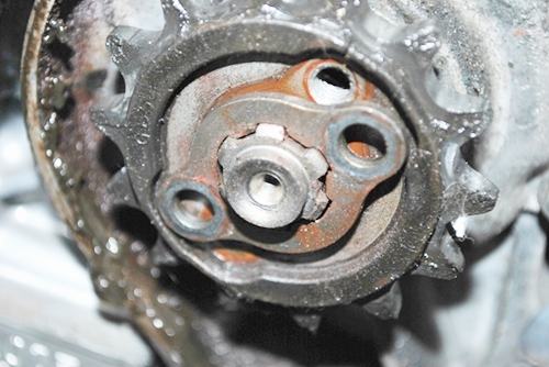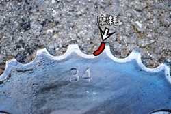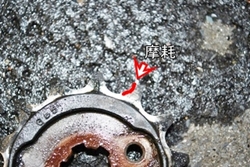 ドライブ(写真は見難いが)・ドリブンの歯とも、写真右斜面側が若干摩耗しているのがわかる。