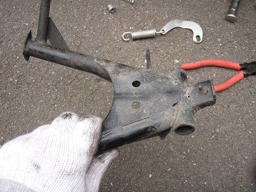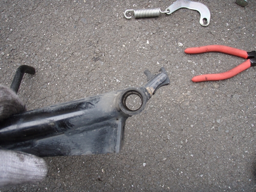 このメインスタンドの保持スプリングと先のプレートを外す。